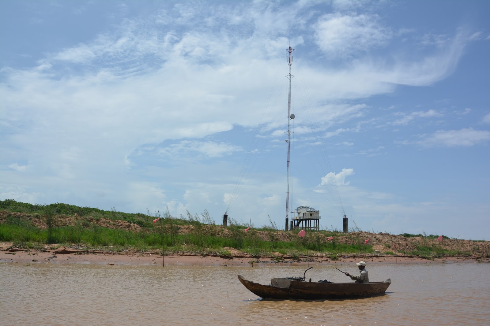 | 行動電話基地臺和傳統的小船形成強烈的對比 |