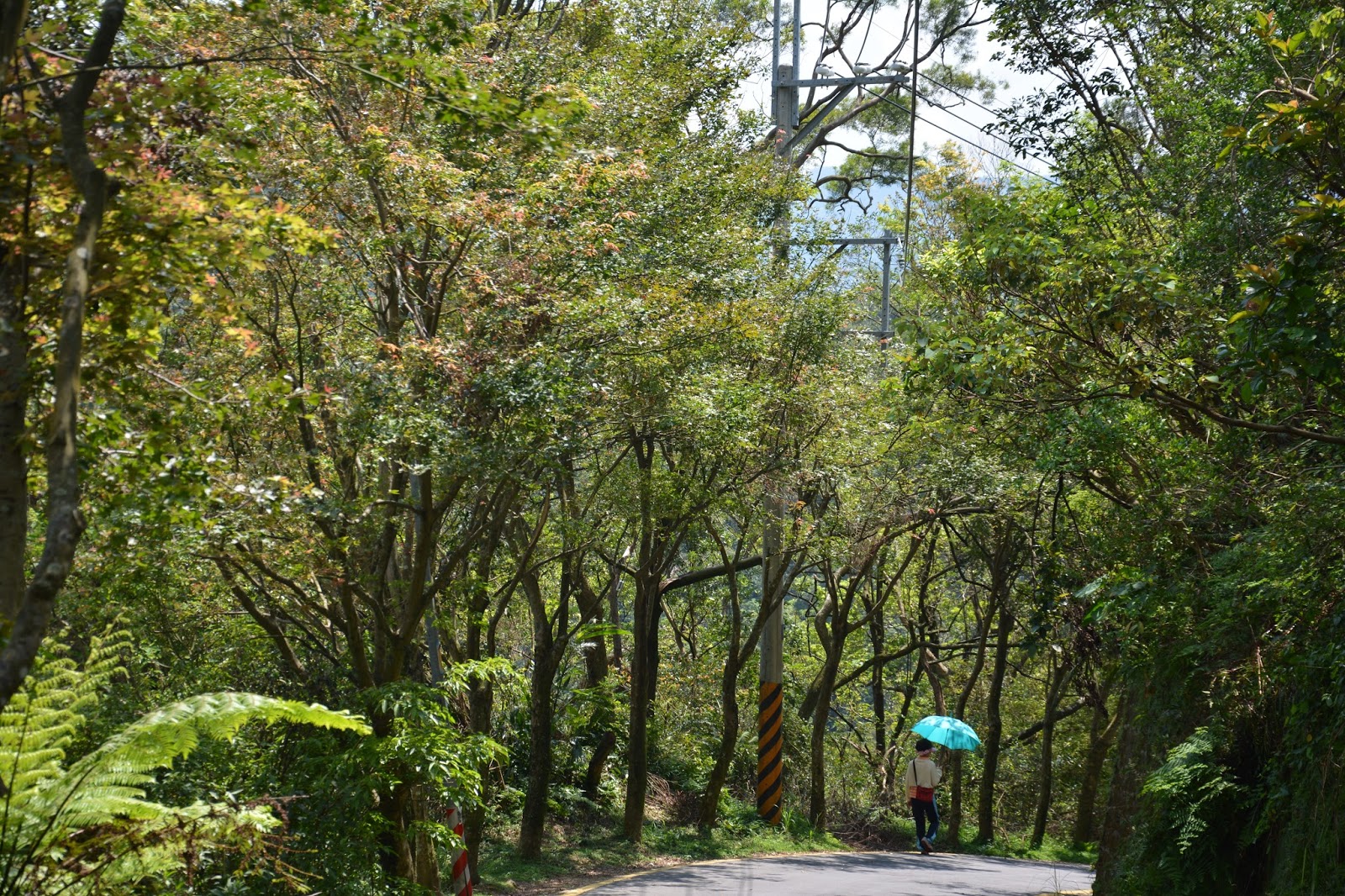 | 秋天了, 綠傘點綴了漸紅的楓樹 |
