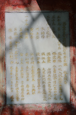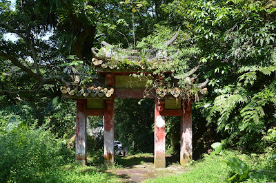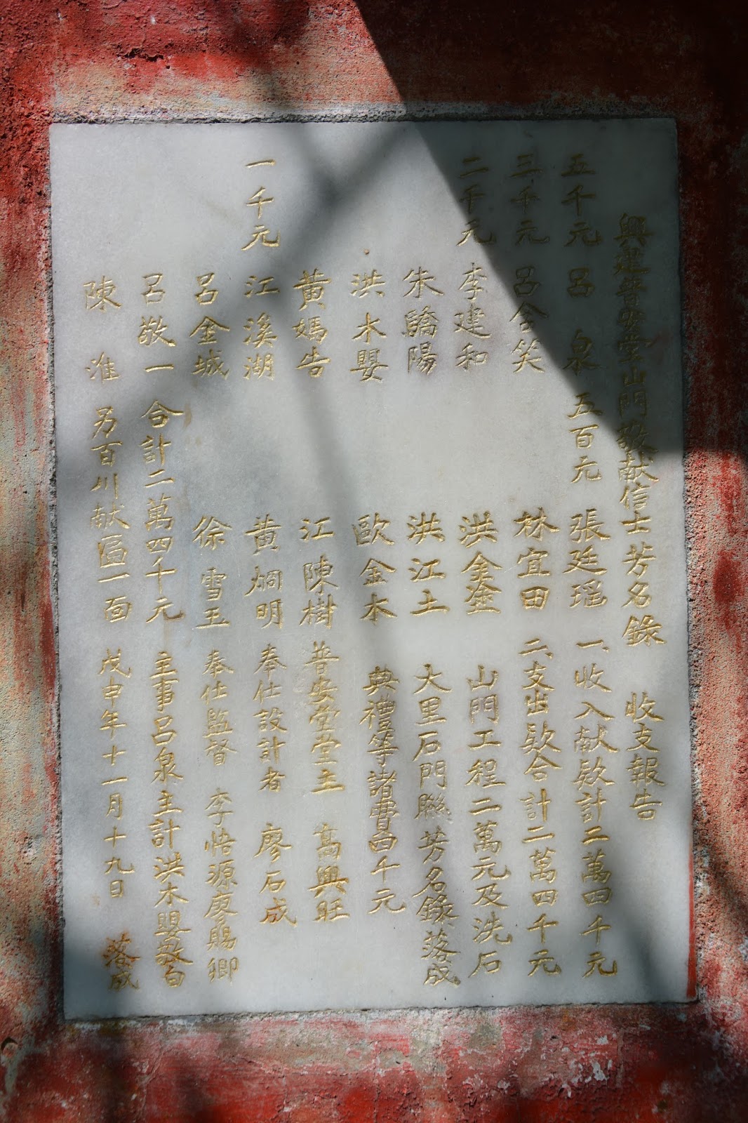離開小溪,騎在林蔭道上,並不覺得,也或許是秋天了吧!没多久,看到左側的"普安堂牌樓",讓我非常的興奮!牌樓是紅簷灰柱體,非常的古典。一條石階古道延伸到座落在大樹下的牌樓。石階上長滿苔蘚,石頭圓潤平滑,可以感受到它的年代。只是,我不懂,為何平滑的石階會有苔蘚?按常理說,"滾石不生苔",常走的步道不可能長滿苔蘚的,除非是人煙稀少或是廢除的古道,否則這兩者是不可能共存的。心中雖有疑惑,但並不影響我深入古道的興緻。
